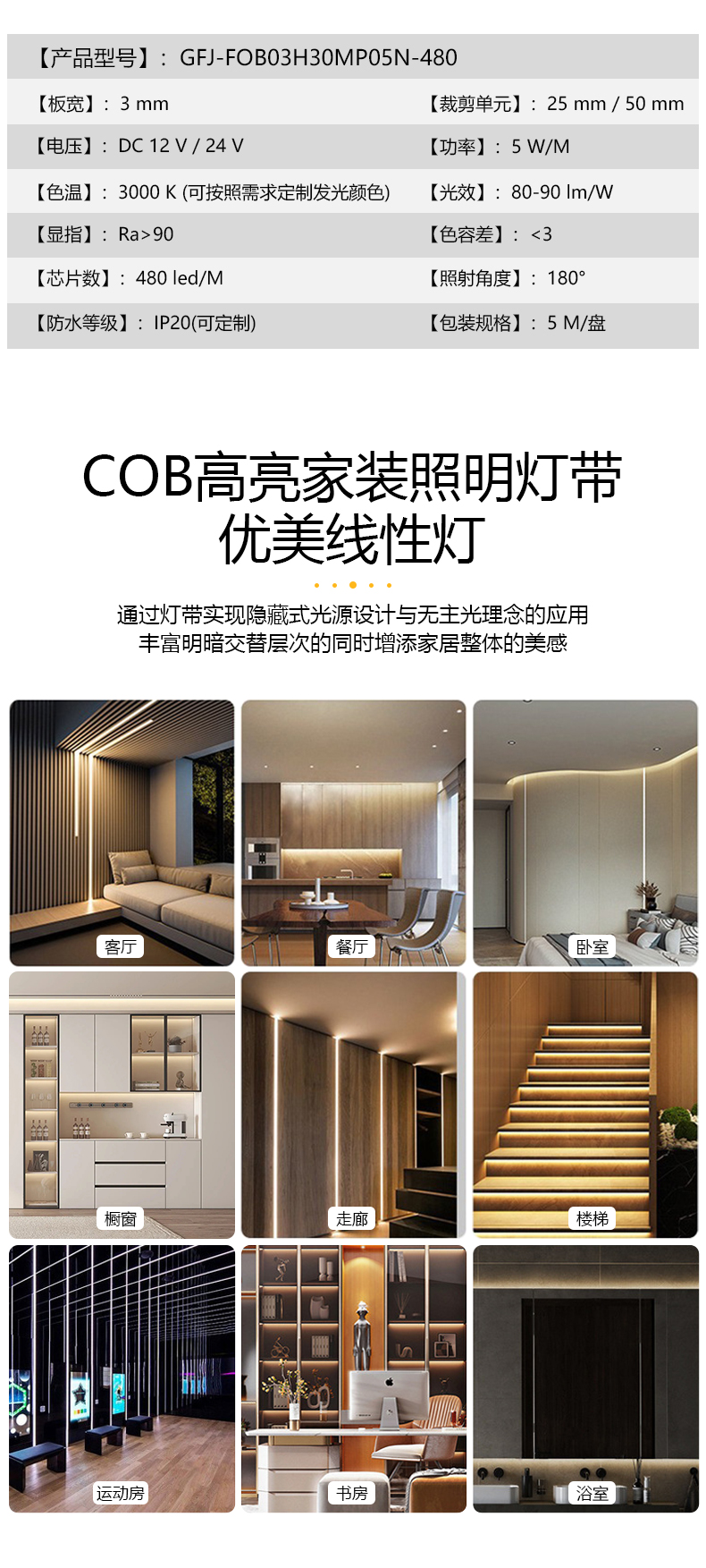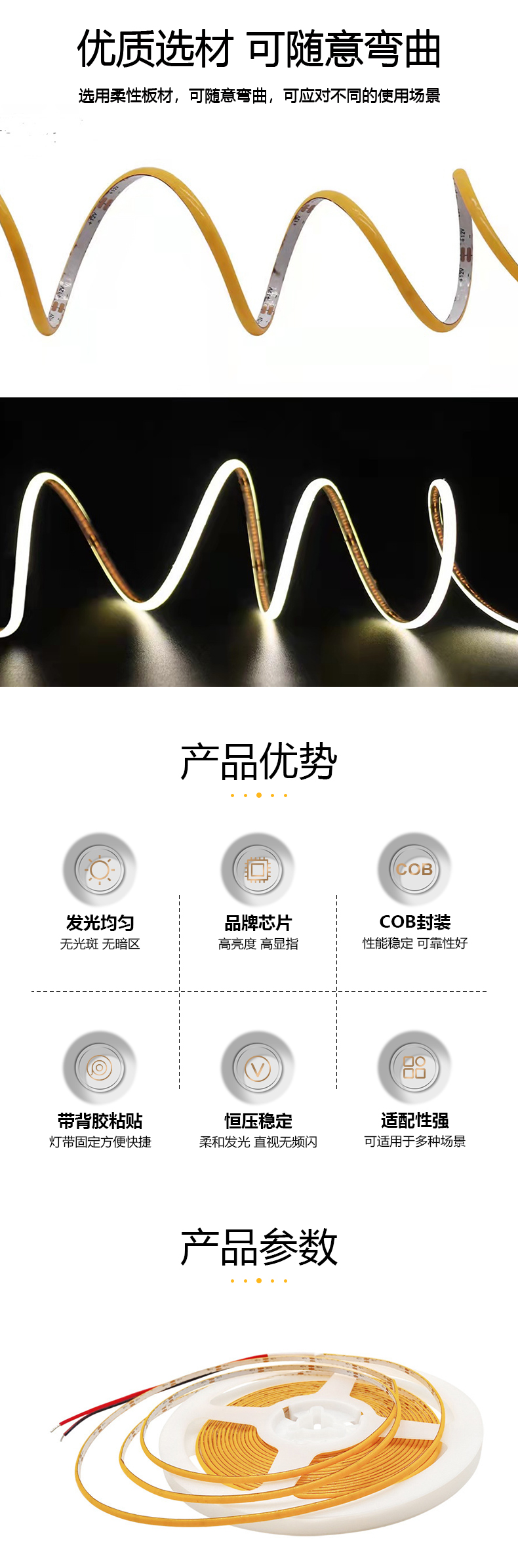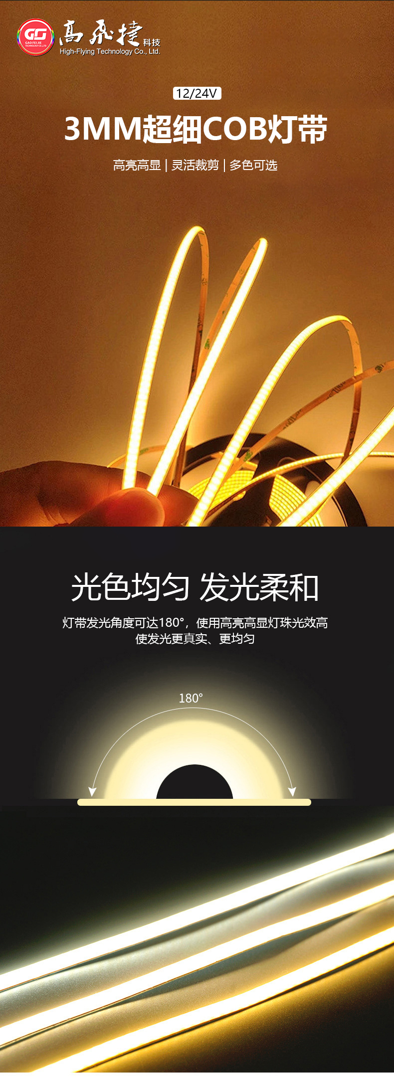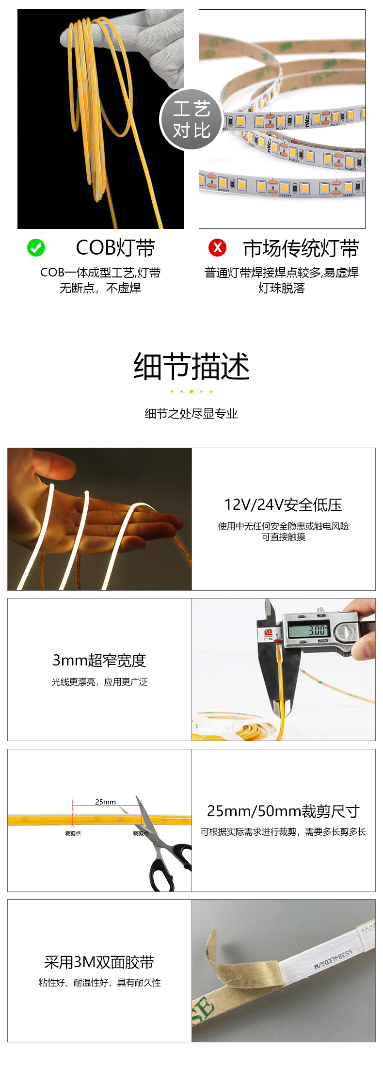 熱門標簽: 高亮度高顯指3mm超窄柔性COB燈帶3M自粘雙面膠低壓安全可直接觸摸
